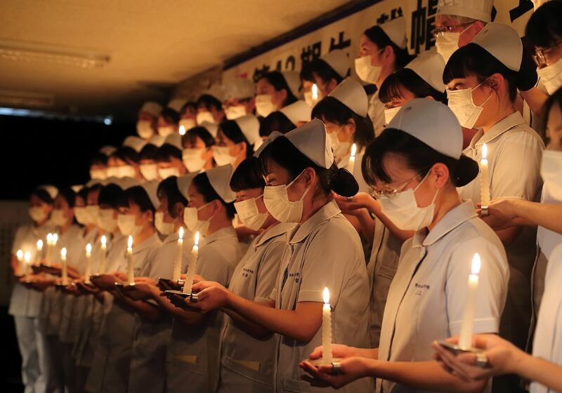 入学して7ヶ月。看護に必要な基礎知識を学び、看護者としての第一歩を踏み出す厳粛な式です。静寂な会場で、ローソクの光に照らされながら、看護の道に勤しむことを誓います。